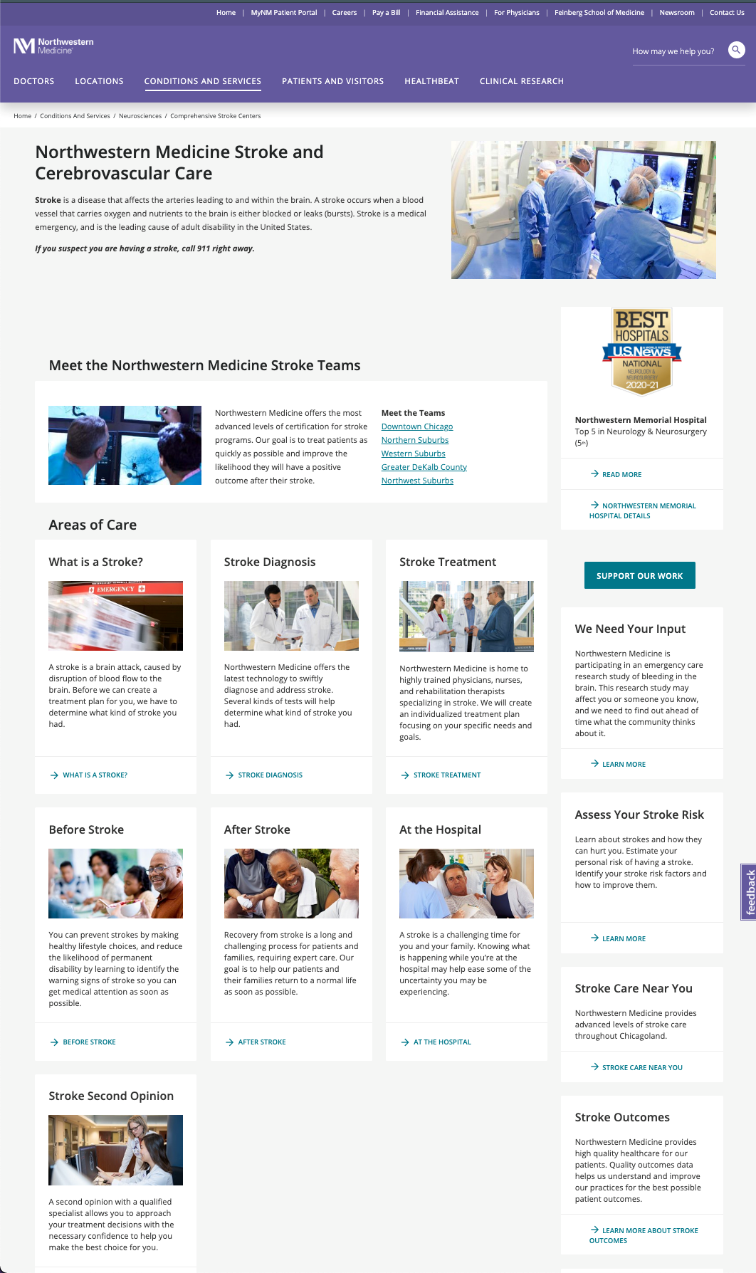 Northwestern Medicine's Comprehensive Stroke Center is one of the most advanced in the country. However, its web presence lagged behind due to outdated and disorganized content. I was commissioned to redesign the Stroke pages to capture the expertise and level of care provided by the Stroke Center and its physicians.